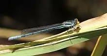 A medium-sized damselfly (length 31–3 mm; wingspan 39–47 mm).[3] The face is black and yellow and it lacks post-ocular spots. The eyes are black above and yellow below. The synthorax is dark blue above and the sides are pale, pruinescent blue. The abdomen is dark blue above and yellow green below, ageing to pruinescent grey.[2]