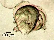 In sac-spawning krill,[Note 1] there is an intermediary phase called pseudometanauplius, a newly hatched form distinguished from older metanauplii by its extremely short abdomen. In some species, this form is not considered a separate developmental stage as it develops into a metanauplius without molting; in other species such as Nyctiphanes couchii, it can be separated from the metanauplius stage by the molt of a very thin cuticle soon after hatching.[1]