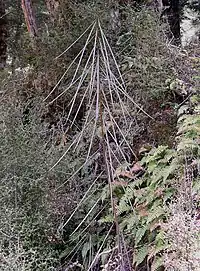One of the theories about this curious change of appearance is that the young plant had to protect itself against browsing by the moa, the giant flightless bird that roamed New Zealand's bush in prehistoric times. Once above moa height, it was out of danger and turns into a "regular" tree. A study of leaf colour development in P. crassifolius found that leaves of seedlings would blend with leaf litter, while juvenile leaf colouration would draw attention to their spines. A closely related Chatham Island species, which evolved in the absence of moa, did not display these changes.[1]