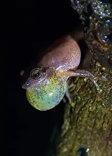 Amboli bush frog with enlarged vocal sac for mating calls