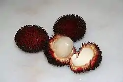 The fruit is ovoid, 5-7.5 cm long, dark red, with its thick, leathery rind closely set with conical, blunt-tipped tubercles or thick, fleshy, straight spines, which are up to 1 cm long.[2] There may be one or two small, undeveloped fruits nestled close to the stem. Within is the glistening, white or yellowish-white flesh (aril) to 1 cm thick, more or less clinging to the thin, grayish-brown seedcoat (testa) which separates from the seed. The flavor is generally much sweeter than that of the rambutan.[2] The seed is ovoid, oblong or ellipsoid, light brown, somewhat flattened on one side, and 2 to 3.5 cm long.