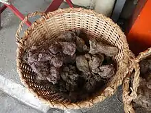 Purple yams have edible tubers which have a mildly sweet, earthy and nutty taste, reminiscent of sweet potatoes or taro. The violet cultivars, in particular, turn dishes distinctively vivid violet because of the high amount of anthocyanins.[20] Purple yams are also valued for the starch that can be processed from them.[3] Purple yam is most common in Philippine cuisine (where it is known as ube or ubi). It is widely applied for many Philippine desserts, such as ube cake, ube cheesecake and ube crinkles, as well as an ingredient or flavor for ice cream, milk, donuts, tarts, jam and other types of pastries. It is often eaten boiled, baked, or as a sweetened dessert called ube halayá; the latter being a popular ingredient in the iced dessert called halo-halo.[21][22][23] Purple yam desserts have more recently entered the United States through Philippine cuisine, under the Filipino name "ube". It is particularly popular due to the striking violet-purple color it gives to desserts.[20][21][24]
