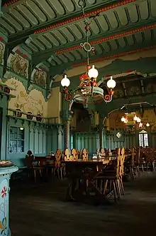 The most famous buildings on Pustevny are Libušín and Maměnka. Both of them were built in 1898 thanks to the efforts of the touristic club Pohorská jednota Radhošť. They are richly decorated log buildings, typical for the Valašsko region and Slavic architecture in general. On March 3, 2014, Libušín was heavily damaged by fire.[2]