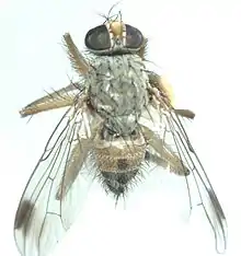 The head of adult Pygophora has the upper inclinate frontal setae inserted much closer to lower reclinate frontal setae than to lower inclinate frontal setae. The arista of the antennae is very plumose (hairy) on the basal half and bare on the apical half (rarely, the basal four-fifths are sparsely plumose. The ocellar setae are moderately developed and always distinct. On the thorax, the lowest sternopleural setae is much shorter and finer than either of the upper sternopleural setae. The fore tibia has a strong submedian postero-ventral seta.[2]