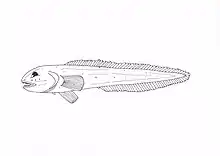 Pyrolycus jaco is long and slender with an eel-like appearance. Its body is a very pale pink and purple color that is semi-translucent.[2] The underside of the fish as well as the snout and jaw are darker than the rest of the body. The fins are very light in color, similar to the body, and are also semi-translucent. There is a very faint pattern on most of the fish that is a light brown color. This fish contains no lateral line or scales and has a gelatinous flesh.[2] The skin resembles that of human flesh in color and texture. The pectoral fin has between fourteen and fifteen rays within them and sixteen to seventeen gill rakers.[2] Fins of this fish appear to be smooth and seamlessly connected to the body having a thick membrane between each fin ray. Pyrolycus jaco has two types of teeth which are a mixture of palatine and vomerine teeth.[2] A long gill slit is present and reaches to above the pectoral fin. This fin includes seven to eight dorsal fin rays and is found close to the midline of the body.[2] Located anterior to the pectoral fin is the beginning of the pelvic fin. Just above the middle of that pectoral fin is where the dorsal fin begins. The anal fin then starts close to the middle of the body. No information is given on the caudal fin of this species because it was unable to be preserved and was not documented before the destruction occurred. There are five suborbital bones present arranged in an L-shaped pattern.[2] This species includes many differences in the number of pores from close relatives setting it apart from others within the same family. Pores of this fish are very prominent on the skull just below the eyes and above the gill slits. There are two nasal pores, three postorbital pores, two occipital pores which are the smallest of the pores, and a lack of the interorbital pore.[2] The head of Pyrolycus jaco has a long neurocranium and small rounded eyes. Not extending past the middle of the eye is the maxilla. The snout of this species does not go past the upper jaw and is relatively round. The Pyrolycus jaco also has two nubs of pyloric caeca present within it. The Zoarcidae family is commonly referred to as eelpouts, a group containing almost 60 genera and nearly 300 species, though not true eels like those in the order Anguilliformes (Frickle 2023).[2]