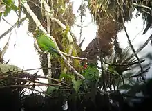 The El Oro parakeet's breeding season appears to span from March to July. It nests in natural tree cavities that have been noted as high as 24 m (80 ft) above the ground. It uses a variety of trees but Dacroide peruviana appears to be preferred. It also uses nest boxes provided by Buenaventura Reserve.[4][1] El Oro parakeets breed cooperatively, a breeding pair being accompanied by up to six helpers.[7]