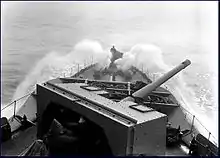 The almost-identical Mk XII gun was deployed in twin mountings CP Mk XIX on the Tribal-class destroyers of 1936 and J, K and N classes of 1938. This mounting limited the maximum elevation to 40 degrees, but all twin CP Mk XIX were dual-purpose mountings and were equipped with Fuze Setting Pedestals or Mk V Fuze Setting Trays,[2] to allow the mountings to be fired against aircraft while being controlled by the Fuze Keeping Clock (FKC) fire control computer. Typical maximum rate of fire was twelve rounds per gun, per minute.[3][4] During gunnery trials in 1930, HMS Basilisk' was able to fire "...five rounds in 17 seconds."[5] The Mk XII gun fired a 50 lb (23 kg) shell and used a separate cartridge, with both shell and cartridge being loaded via a loading tray, with power ramming, elevation, and traverse. The maximum range at 40 degrees elevation was 16,970 yards (15,520 m) fired at the new gun muzzle velocity of 2,650 fps (808 m/s).[1] The 40-degree elevation was justified on the grounds that destroyers would be screening the battle-fleet during aerial attack, and 40 degrees elevation was adequate to engage aircraft that were concentrating their attack on other ships.[6]