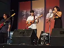 Quetzal was featured in the soundtrack to the 2004 short film Stand Up For Justice: The Ralph Lazo Story. In 2013, the band won a Grammy for Best Latin Pop, Rock or Urban Album.[2] Martha Gonzalez and Quetzal Flores are co-producers of Entre Mujeres, a CD released in 2012. The band was invited to speak and perform in the U.S. Library of Congress and Kennedy Center's Homegrown music series. The Smithsonian Institution's traveling exhibit "American Sabor: Latinos in U.S. Popular Music" feature Quetzal as leaders and innovators of Chicano music. Smithsonian Folkways label released the 2013 Grammy-winning CD Imaginaries, marking the importance of Gonzalez's past and ongoing work.[3] They have also been instrumental in developing Fandango Sin Fronteras, a dialog between Chicanos and Chicanas from California and jarochos-musicians who play the Veracruz style.