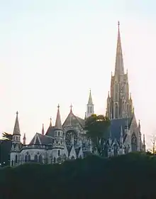 This architectural tour de force in the decorated Gothic style was designed in 1862. Construction was delayed after the Otago Provincial Council decided to reduce Bell Hill, on which it was to stand, by some 12 metres (40 ft): the hill had proved a major impediment to transport in the rapidly expanding city.[3] As a result the foundation stone wasn't laid until 15 May 1868. Just before the official opening on 23 November 1873 Lawson realised while sailing up the harbour that the spire was 15 feet (4.6 m) too short, and had a slight lean. He insisted on the spire being dismantled and rebuilt to the correct specifications, which was completed in 1875.[3]