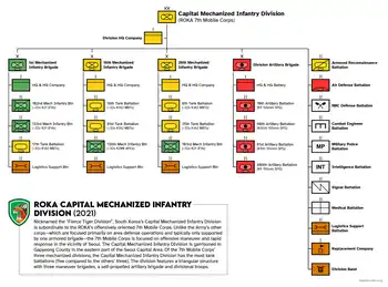 The Capital Mechanized Infantry Division (Korean: 수도기계화보병사단, hanja: 首都機械化步兵師團), also known as Fierce Tiger Division (Korean: 맹호부대, hanja: 猛虎部隊), is currently one of the six mechanized infantry divisions in the Republic of Korea Army. It is part of the VII Maneuver Corps, tasked with covering approaches to Seoul from North Korea and counterattack operations.