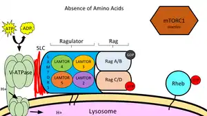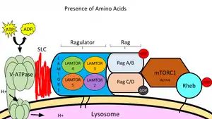 - ↑ Yao Y, Jones E, Inoki K (July 2017). "Lysosomal Regulation of mTORC1 by Amino Acids in Mammalian Cells". Biomolecules. 7 (3): 51. doi:10.3390/biom7030051. PMC 5618232. PMID 28686218.
