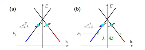As for the direct effect, this analysis has been carried out for the inverse Edelstein effect because in this case only two energy branches are present. For what concerns the inverse Rashba–Edelstein effect, the process is very similar despite the presence of four energy branches, with spin-momentum locking, in the dispersion relation and two consequent Fermi countours with opposite helicity.[1][7] In this case, the two Fermi countours, when a spin accumulation is generated inside the material, will be displaced one from the other, generating a charge current, at variance with the equilibrium case in which the two Fermi countours are concentric and no net momentum unbalance nor spin accumulation are present.[1][9]