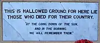 The replica memorial is based on the 1941 memorial in the Tobruk War Cemetery, built by Australian soldiers[2] during the siege, which has since been destroyed. Incorporated into the memorial is the original inscription stone, the only surviving relic of that memorial, and at one time a front step of the Tobruk Post Office.