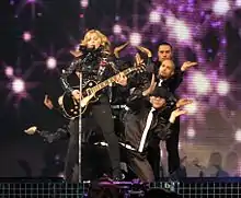 "Ray of Light" has also been featured in the set lists of four Madonna tours – 2001's Drowned World Tour, 2006's Confessions Tour, 2008–2009's Sticky & Sweet Tour, and 2023-2024's The Celebration Tour. On the Drowned World Tour, it was included as the fifth song on the Neo-Punk segment, where the singer performed it wearing punk inspired clothing, and the backdrop screens showed an extended version of the song's music video. This time, the electric guitar was played by Monte Pittman.[98] Michael Hubbard from MusicOMH noted that "things quickly hotted up with [...] 'Ray Of Light', a track that was quite simply as sublime as it was infectious".[99] In 2005, Madonna performed "Ray of Light" during the Live 8 benefit concert,[100] and a year later at the 2006 Coachella Valley Music and Arts Festival in Indio, California.[101] During her 2006 Confessions Tour, Madonna included a rock version of "Ray of Light" as the second song of the show's third act, the Glam-Punk segment. For this performance the singer played the electric guitar and urged the audience to jump-along. She was accompanied by six male backup dancers, dressed in black outfits and white ties doing a synchronized choreography.[102] Rolling Stone called the performance "hard-rocking".[103]