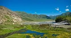 The Lhasa River (or Kyi River) forms where the Reting Tsangpo is joined by two smaller rivers, the Phak Chu and the Phongdolha Chu which flows from Damxung County.[2] The river is spanned by a large metal suspension bridge just above the juncture.[4] The combined length of the Reting Tsangpo and the Lhasa River is about 400 kilometres (250 mi).[1] The river is said to excellent for kayaking and white water rafting, although as of 2015 it had been visited by few tourists interested in these sports.[5]
