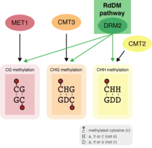 RdDM is the only mechanism in plants that can add DNA methylation to cytosines regardless of sequence context.[55] DNA methylation in plants is typically divided into three categories based on the sequence context of the methylated cytosine: CG, CHG, and CHH, where H is any nucleotide except G. These reflect the different sequence contexts targeted by several DNA methylation pathways in plants. These context-specific pathways are primarily involved in maintaining existing DNA methylation patterns. The highly conserved methyltransferase MET1 (homolog of mammalian DNMT1) maintains DNA methylation in the CG context, while two conserved plant-specific methyltransferases, Chromomethylase 3 (CMT3) and CMT2, help maintain CHG and CHH methylation, respectively.[74][75][76][77] Unlike these pathways, RdDM leads to the addition of DNA methylation at all cytosines regardless of their sequence context. Like MET1, CMT2 and CMT3, RdDM is primarily involved in maintaining existing DNA methylation patterns.[55] However, RdDM is also the only pathway capable of adding DNA methylation de novo to previously unmethylated regions in plants.