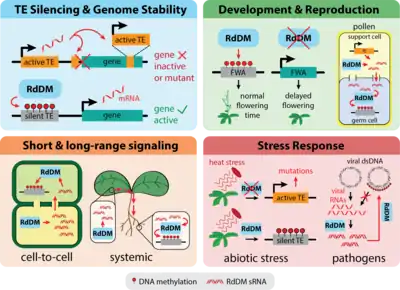 RdDM is involved in a number of biological processes in the plant, including stress responses, cell-to-cell communication, and the maintenance of genome stability through TE silencing.
