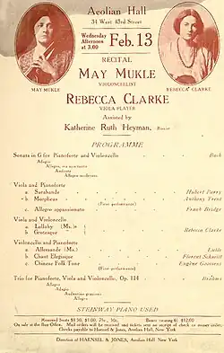Following her criticism of his extra-marital affairs, Clarke's father turned her out of the house and cut off her funds.[7] She had to leave the Royal College in 1910 and supported herself through her viola playing. Clarke (along with Jessie Grimson) became one of the first female professional orchestral musicians when she was selected by Sir Henry Wood to play in the Queen's Hall Orchestra in 1912.[4][8] She was highly sought after as a violist, playing with Artur Schnabel, Pablo Casals, Jascha Heifetz, Jacques Thibaud, Guilhermina Suggia, Arthur Rubinstein, Pierre Monteux, and George Szell, among others.[9]