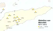 The East Timorese rebellion of 1911–1912, sometimes called the Great Rebellion or Rebellion of Manufahi,[lower-alpha 1] was a response to the efforts of Portuguese colonial authorities to collect a head tax and enforce the corvée, part of their larger effort to encourage cash crop agriculture and construct modern infrastructure.[1] The countrywide conflict of 1911–12 was the culmination of a series of revolts led by Dom Boaventura, the liurai (chief)[lower-alpha 2] of the native kingdom of Manufahi. The first lasted from 1894 to 1901, the second from 1907 to 1908. In 1911 Boaventura led an alliance of local kingdoms in the last and most serious revolt against the Portuguese.[2]