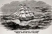 The hull of Red, White and Blue was constructed of galvanised iron, "pressed and moulded to a clinker built configuration" by the inventor Oliver Roland Ingersoll. This Ingersoll's Improved Metallic Lifeboat was a new design for onboard lifeboats and jolly boats, the intended advantage being lightness and ease of maintenance. She was 26 ft (7.9 m) LOA of 2.38 tons, beam 6.17 ft (1.88 m) with a hold depth of 2.66 ft (0.81 m), or 3 ft (0.91 m) from deck to keel (not that she had a deck), and was pointed at bow and stern.[3] She was fitted out with a ship-rig at New York.[nb 3][3][4] The tiny rigging was in proportion to the hull, that is to say, a fraction of the size of a normal cargo ship.[4] The sails were made to the design of D.M. Cumisky of 39 South Street, New York, and the spars were made by Arthur Bartlett of 252 South Street.[1][5]