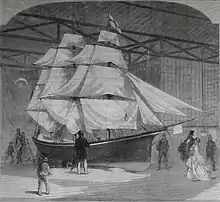 The ship was launched on 21 June 1866, after having a false keel fitted, making a total keel depth of 7.5 in (19 cm). "She was launched with all her spars standing, bows on, from a dock five feet above the level of the water", with Captain J.M. Hudson aboard. She landed neatly, she did not tip over, and Hudson did not get wet.[1] In 1866, Red, White and Blue was believed to be the "smallest ship ever to cross the Atlantic".[1][3][9] After leaving Margate, the crew took the ship to The Crystal Palace where from 25 August she was exhibited during the rest of 1866.[1][3] At The Crystal Palace, Hudson and Fitch attended daily to make the ship's log available, and to answer questions.[2][10]