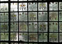 When the building itself had been constructed, Morris set about decorating the interior, however specifically chose to design and create almost everything himself. Only a few pieces of decor were pre-bought as ready-made items, namely the Persian carpets, and blue china or delft.[38] Morris took his painted settle from the Red Lion Square flat and had it transported in pieces to Red House, where it was reassembled in the drawing room.[39] Many other items of furniture were specially designed by Webb, including the oak dining table, other tables, chairs, cupboards, copper candlesticks, fire dogs, and glass tableware.[40] The plastered walls and ceilings were given simple designs in tempera, although more complex designs were planned for the hall and main living rooms.[39] Stained glass windows were installed in the house, with designs created by Burne-Jones and Webb.[41] In reference to the route taken by Medieval pilgrims headed to Canterbury, Morris termed the passage which connects the main hallway to the house's rear entrance, "The Pilgrim's Rest".[42] The garden was similarly unique in its design,[39] with Morris insisting on integration of the design of the house and garden; the latter was divided into four small square gardens by trellises on which roses grew.[43] The flower beds were bordered with lavender and rosemary while lilies and sunflowers had also been planted in the garden.[44] White jasmine, roses, honeysuckle and passion flower were planted to climb up the walls of the house.[45]