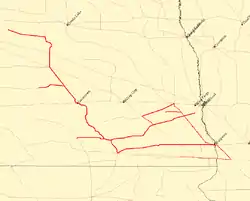 ![]() Route map of the RRVW. Solid lines are trackage owned by the railroad; dotted lines are those with trackage rights. | |