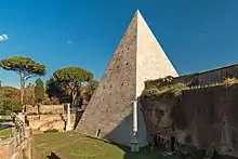 Regio XIII also contained the Emporium, the first port built on the Tiber, and attached to the port were the warehouses of the Horrea Galbae,[4] built around the tomb of Servius Sulpicius Galba, while nearby was the Forum Pistorium. The region also possessed two unusual features still present today: Monte Testaccio, an artificial hill, and the Pyramid of Cestius. At the turn of the 5th century, the Regio contained 17aediculae (shrines), 130 domūs (patrician houses), 35 horrea (warehouses), 60 balneae (bath houses) and 88 loci (fountains).[5]