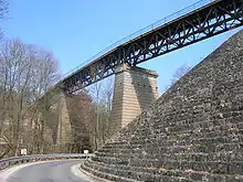 The line has grades from Plaue of 1:50 to 1:70 and sections with radii of only 300 m as it passes through a genuine mountain range. The largest bridge on the line is the Marien bridge near Plaue. It spanned former federal highway 4 at line-kilometre 15.9. The biggest bridge on the line is the arched viaduct in Angelroda. It is 26.5 m high, 100.4 m long and consists of three spans. 253 t of steel were used for the bridge. It was built in a very innovative way as a projected bridge supported by auxiliary scaffolds. For this purpose, the individual sections of the bridge were mounted on the projections of the viaduct and moved over the bridge piers by being hauled by cable.[8] The position of the entire bridge on a sharply curving track made this bridge construction difficult and also posed a challenge for the designers. A curiosity is also the construction of the retaining walls at the bases of the bridge piers. Here, the supporting walls were not inclined, as is normal custom, but were stepped instead. It is not known why the greater and self-reinforcing stability of a sloped retaining wall was not used. The original steel lattice structures of the two piers were covered in concrete in 1905 to increase their load bearing capacity. In contrast to the steel pillars, the rebuilt concrete bridge piers were again designed to receive the superstructures for a second track that was never installed. On the new, wider piers, a new, stronger bridge was built parallel to the existing bridge and the track was swung onto it and the old superstructure, with the exception of the old bridge deck, which was cast in place, was demolished. Since then the eastern side of the piers has been undeveloped. The masonry structure of the bridge piers is deceptive and has only a visual character. In fact, the pillars are not brick, but are cast in mass concrete.