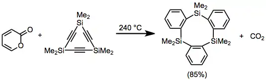 Carbon dioxide is a common dienophile released during rDA reactions. Diels–Alder adducts of alkynes and 2-pyrones can undergo rDA to release carbon dioxide and generate aromatic compounds.[17]