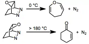 Release of nitrogen from six-membered, cyclic diazenes is common and often spontaneous at room temperature. In this particular example, the epoxide shown undergoes rDA at 0 °C. The isomer with a cis relationship between the diazene and epoxide reacts only after heating to >180 °C.[15]