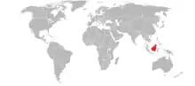 The species is known to live only on hillsides in lowland primary forest on the island of Borneo, at altitudes of under 1,100 metres (3,600 ft). It has occasionally been seen in orchards and secondary forests but sightings are rare. Due to deforestation it is considered to be vulnerable and is totally protected in Sarawak, one of the two Malaysian states on Borneo. Hunting with a licence is legal in Sabah, the island's other Malaysian state.[2] Some natives use the squirrel's tail to decorate the hilt of their parang knives.[3]