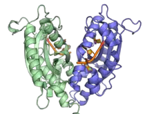 ![]() A ribonuclease T dimer in complex with DNA (orange), from PDB ID 3NH1.[1] | |||||||||