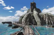 Riven has more complex and numerous puzzles than its forerunner and is set in a larger virtual world for players to explore.[12] Whereas in Myst the objective of the game is to travel to different Ages to solve puzzles before returning to a "hub Age", Riven's gameplay takes place on the five islands of the Age of Riven. Much of it consists of solving puzzles to access new areas of the islands, though players are also able to explore without fulfilling objectives.[11] The volcanic landscape depicted, with its steep cliffs and crater lakes, is bestrewn with mechanical, Victorian-style artifacts such as elevators, pipes, levers and roller coaster-like transports.[11][12] To solve the game, players must consider the purpose and physical principles of these artifacts as well as their role in the fictional culture.[12]