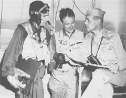 Keller (center) discussing a mission with Captain John Thach (right), commanding officer of aircraft carrier USS Sicily during combat operations against North Korea, August 8, 1950. First lieutenant Roland B. Heilman on the left.