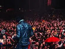 A rock festival is an open-air rock concert featuring many different performers, typically spread over two or three days and having a campsite and other amenities and forms of entertainment provided at the venue.[1] Some festivals are singular events, while others recur annually in the same location. Occasionally, a festival will focus on a particular genre (e.g., folk, heavy metal, world music), but many attempt to bring together a diverse lineup to showcase a broad array of popular music trends.[2]