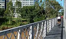 In November 1996 the timber pedestrian footway on the bridge was replaced by a non-slip surface mounted on plywood sheeting.[1] Concerns were raised in 2010 by pedestrians and cyclists about the safety of the walkway when noticeable holes began appearing which were believed to be due to the plywood rotting away.[3] The walkway was temporarily closed the following year to allow the walkway to be repaired.[4]