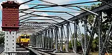 The northeastern end has two 100-foot (30 m) riveted 8 panel through Pratt trusses with parallel chords and decking. A similar single truss is located at the southwestern end of the bridge. The centre of the bridge has two 250-foot (76 m) riveted 16 panel hogback double intersection Pratt trusses and decking on wrought iron caissons.[1]