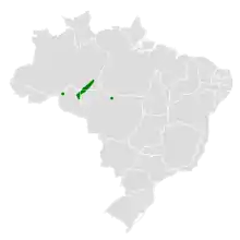The Rondonia bushbird was first described near the Rio Jiparana, a tributary of the Rio Madeira in the Brazilian state of Rondônia.[2] Since then it has been documented at additional sites between the rios Madeira and Sucunduri to its east in the state of Amazonas, and also in Mato Grosso. It primarily inhabits lowland humid terra firme forest in locations with tangles of vines, a dense understory, and sometimes with Guadua bamboo. It has also been recorded in moderately disturbed forest and near recently logged areas, and once in campina. In elevation it is known only below 300 m (1,000 ft).[4][5][1]