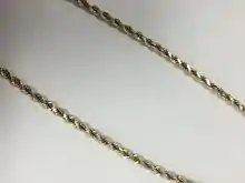 A rope chain is a metal chain necklace consisting of several small links which pattern the shape of a rope. The rope chain begins as a metal wire and is twisted into links.