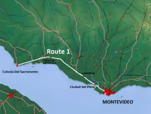 Route 1 is a national route of Uruguay. In 1975, it was assigned the name Brigadier General Manuel Oribe, a national hero of Uruguay.[1] It connects Montevideo with Colonia del Sacramento to the west along the coast. The road is approximately 177 kilometres (110 mi) in length.[2][3]