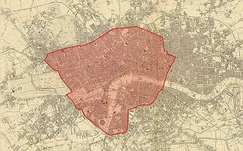 The commission's remit was limited to evaluating proposed lines that came into the urban area bounded by Edgware Road, New Road (now Old Marylebone Road, Marylebone Road, Euston Road, Pentonville Road), City Road, Finsbury Square, Bishopsgate Street, London Bridge, Borough High Street, Blackman Street, Borough Road, Lambeth Road, Vauxhall Road (now Kennington Road, Kennington Lane), Vauxhall Bridge Road, Grosvenor Place and Park Lane.[2]