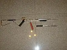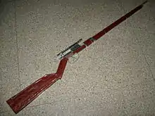 Rubber band guns can be made using only Popsicle sticks, staples, and rubber bands of various styles and sizes. This specialized technique developed and honed by then-high school student Stuart A. Burton[4] is very malleable and can be utilized to develop very advanced and complicated rubber band guns. For instance, using levers and sliding mechanisms, one can make a pump-action shotgun. Using simple geometry and specialized positioning, one can easily make semi-automatic and 2-shot burst-fire weapons, as well as more complicated fully automatic weapons using paperclips as an axis for a rotating firing piece. Occasionally, other materials (like bamboo skewers, for instance) may be used in the making of the gun.