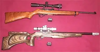 The Ruger 10/22 is a series of semi-automatic rifles produced by American firearm manufacturer Sturm, Ruger & Co., chambered for the .22 Long Rifle rimfire cartridge. It uses a patented 10-round rotary magazine, though higher capacity box magazines are also available. The standard carbine version of the Ruger 10/22 has been in production continuously since 1964,[5] making it one of the most successful rimfire rifle designs in history, with numerous third party manufacturers making parts and accessories for upgrading and customization. The 10/22's aftermarket is so prolific that a complete 10/22 can be built without using any Ruger-made components.