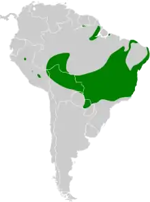 The nominate subspecies of rusty-backed antwren is found widely across south-central and eastern Brazil from the Atlantic Ocean west intro extreme southeastern Peru, much of eastern Bolivia, and central and northeastern Paraguay. F. r. urubambae is found discontinuously in Peru's departments of San Martín, Ucayali, and Cuzco. F. r. chapmani is found discontinuously in southern Suriname and a few east-central states of Brazil. It is believed to be resident in all parts of its range.[2][3]