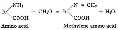 With an amino acid the formaldehyde reacts with the amino group to form a methylene amino (R-N=CH2) group. The remaining acidic carboxylic acid group can then again be titrated with base.[3]