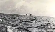 On 15 July 1918, the Carpathia departed from Liverpool in a convoy bound for Boston, carrying 57 passengers (36 saloon class and 21 steerage) and 166 crew. The convoy travelled on a zig-zag course along with an escort in accordance with procedures against submarine attacks.[37] The escort left the convoy early in the morning of 17 July, and the convoy was cut in half. The Carpathia continued west along with six other ships, and as the largest ship in the convoy, she assumed the role of the commodore ship. Three and a half hours later, at 9:15 a.m., while sailing in the Southwest Approaches, a torpedo was sighted approaching on her port side. The engines were thrown in full-astern and the helm was turned hard-a-starboard, but it was too late to avoid the torpedo.[37] The Carpathia was torpedoed near the No. 3 hatch on the port side by the Imperial German Navy submarine SM U-55, followed by a second which penetrated the engine room, killing three firemen and two trimmers, and effectively disabling her ability to escape, as the engines were rendered inoperable by the second torpedo impact.[38] The explosion severely damaged the Carpathia's electrical gear, including the wireless radio apparatus, as well as two of the ship's lifeboats.[37] As a result, Captain William Prothero, in command of the Carpathia since 1916, signalled the other ships in the convoy to send out wireless messages by use of flags. He then had rockets fired to attract the attention of nearby patrol boats. The remaining convoy steamed away at full speed to elude the submarine.[37]
