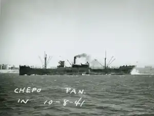 With the start of World War II in Europe United States adopted Neutrality Act which effectively prohibited American shippers from direct sailing into designated war zones such as United Kingdom. United States Line, one of the bigger operators between the US and the United Kingdom, was significantly hampered by the Act which effectively grounded their fleet. They immediately asked Maritime Commission to allow them to transfer nine of their vessels to Panamanian registry. The transfer was initially approved but under pressure and sharp criticism from a number of congressmen and Secretary of State Cordell Hull the shipping line withdrew its application.[27][28][29] Shortly thereafter, United States Line tried to lobby Maritime Commission to allow it to sell the same vessels to their subsidiary, North Atlantic Transport Company, a Norwegian-registered corporation.[30] These vessels were eventually sold to Belgian company, Société Maritime Anversoise, in February 1940. By early 1941, however, most of the transferred ships were lost to enemy action, and the United States Line sought to augment their fleet from the laid up vessels belonging to Maritime Commission. In December 1940 a large number of laid up vessels was offered for sale to British shipping companies.[31] The bidding opened in early January 1941, with United States Line jumping in and placing a bid on five of the vessels, including West Pocasset.[32] The deal was struck on 23 January 1941 and West Pocasset and four other ships of similar size were sold to United States Line for $1,328,384. These vessels then were sold to North Atlantic Transport Company, a subsidiary of United States Line, now a Panamanian registered company.[33] All ships were subsequently renamed after various towns of Panama, with West Pocasset becoming Chepo.