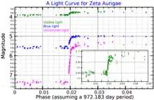 Zeta Aurigae was first recognized as a spectroscopic binary by William Hammond Wright while analyzing photographic plates taken at Lick Observatory between 1898 and 1908. This star is among those earlier described by Antonia Maury as having a composite spectrum.[20] The first orbit was determined in 1924 by William Edmund Harper using measurements taken at Dominion Observatory, his orbital elements are very similar to the most recent determinations. Harper also noticed that the composite nature of the spectrum had disappeared on the one plate when the K type primary was nearest the sun indicating a possible eclipse.[21] In 1932 the eclipsing binary nature of the system was confirmed by Paul Guthnick, Heribert Schneller and independently Josef Hopmann.[22]