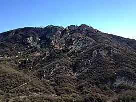 Saddle Peak is a mountain located in the Santa Monica Mountains between Malibu and Calabasas. The summit is accessible via the Backbone Trail. There is also a feeder trail to the top from near the top of Stunt Road (just 1 block below the ridge intersection with Scheuren Road at the viewpoint) maintained by the Santa Monica Mountains Conservancy. And there is an informal trail up the bottom East nose of the massif right across the intersection from the Scheuren Viewpoint. This latter trail passes around a water tower and eventually joins the main trails near the top.